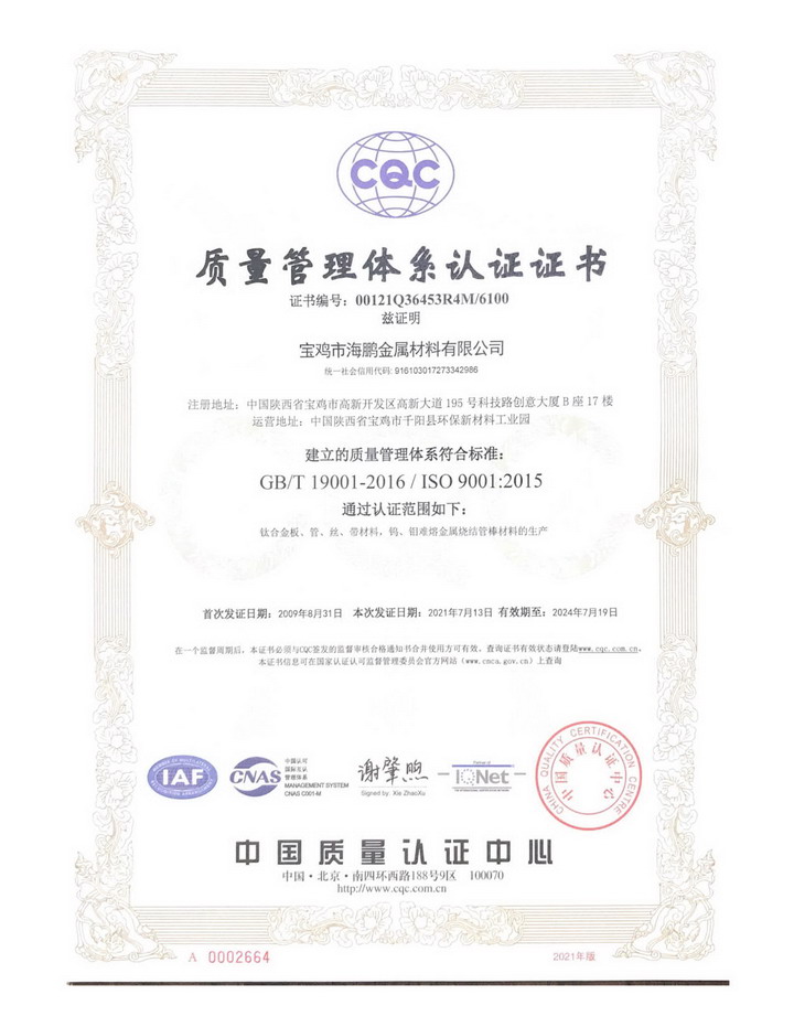 質(zhì)量體系認證書